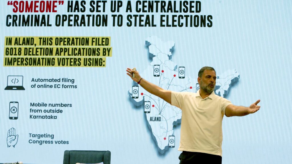 राहुल गांधी ने करीब 31 मिनट का एक प्रजेंटेशन दिया, जिसमें उन्होंने वोट डिलीशन (नाम हटाने) के कथित सबूत दिखाए। इस दौरान वे कर्नाटक के महादेवपुरा और आलंद जैसे क्षेत्रों के कुछ मतदाताओं को भी साथ लाए, जिनके नाम वोटर लिस्ट से हटा दिए गए थे। उन्होंने कहा कि 2024 के लोकसभा चुनावों में बड़े पैमाने पर गड़बड़ी की गई और यह सिर्फ कर्नाटक तक सीमित नहीं है — महाराष्ट्र, हरियाणा और उत्तर प्रदेश में भी ऐसा ही हो रहा है।
